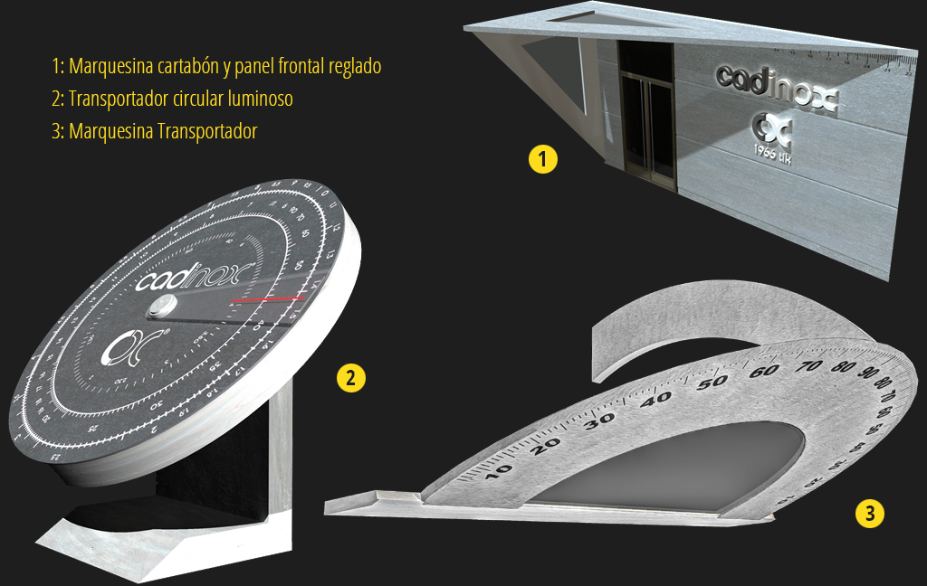 Lo que me llevó ha realizar el diseño de la pieza principal, surgió de un comentario por parte de uno de los socios de Cadinox refiriéndose a lo inhóspito del acceso a la puerta principal. Ya estaba pensando en realizar piezas en forma de herramienta pero no sabía como articular esta idea. El comentario anterior me llevó a diseñar un gran cartabón que hiciera de marquesina. Posteriormente todo fue rodado. El transportador circular luminoso encontró su lugar y lo mismo ocurrió con la marquesina transportador. El resultado es algo así como una serie de herramientas gigantes distribuidas por el exterior de la empresa, herramientas básicas, muy antiguas, y aunque de menor uso ahora, igual de eficaces que hace siglos. Al estar construidas en acero inoxidable, y gracias a las numeraciones, a su simplicidad formal además de la escala, el resultado parece llevarnos a una idealización técnica. En cualquier caso prepara a quien accede o advierte a quien pasa, que lo que ocurre dentro de los muros de Cadinox es altamente tecnológico, preciso y único.